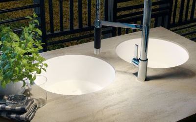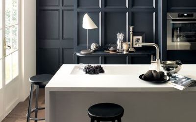 The architect Jean-Jacques Marvielle, was pleased with the result, “We obtained a unique and innovative product: Corian® it delivers a feeling of longevity, which is very appreciated in kitchen. The countertop and table borders reinforce this impression. The strength of the material, the possibility to obtain round shapes, the absence of visible seams, the uniform colours and the artistic freedom are all qualities that led to the choice of using this material. The independent functions of “water” and “fire” face each other. The central table is the element that connects these two windows of polychromatic light, framed by gray painted cabinets.”