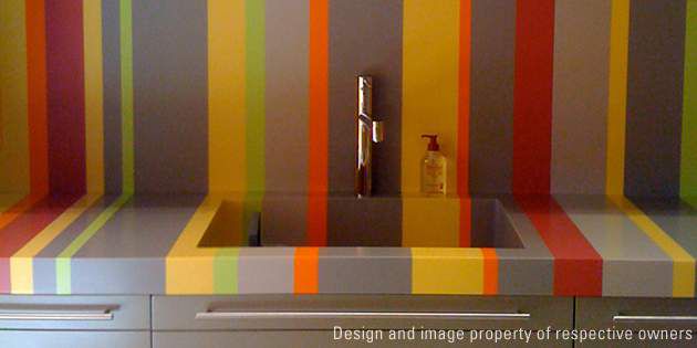 Architect Jean-Jacques Marvielle decided to use a "Bayadere" style for the renovation of a traditional Basque home situated on the banks of Arcachon (southern Atlantic coast of France). The multi-coloured, wide striped fabrics of Basque textile traditions inspired the unifying thread of this project that provided an exemplary canvas to demonstrate the design versatility offered by Corian® solid surface and its many colours. The distinctive "Bayadere" character of the kitchen is recreated on the countertops, sink, cooking area, cabinets and central table, as well as the wall cladding. The specific arrangement of colour bands between the sink and the countertop and between the countertop and the cabinet required meticulous skill.