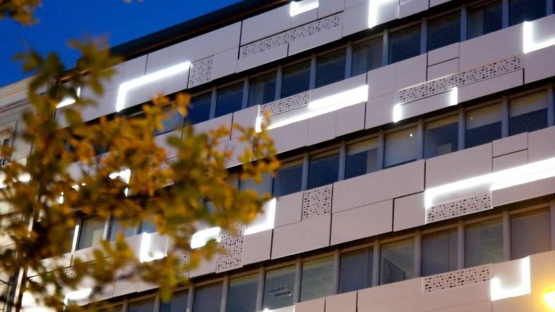 Corian® can be machined and personalized, which has allowed the architects to perforate some of the panels (which are made of 90 by 45cm pieces of material). By doing this, the architects have sought to change the texture of the façade, which helps to give it an iconic look: rich and very characteristic of the design itself. This decision also gave the architects the opportunity to play with illumination. Behind each of the Corian® panels there are hidden LED strips.