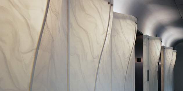 - Versatile Corian® solid surface was thermo-formed into beautiful, curved, three-dimensional panels, with moulding custom-designed for perfect alignment.