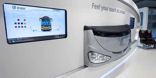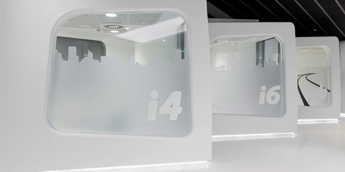 Nothing better and more suitable than the Corian® material to shape the new headquarters of a company based on two fundamental premises: forward-thinking and technological traits and their eyes set firmly on the future. It is precisely this idea that the Irizar Group -worldwide reference in the manufacturing of buses and coaches for passengers transportation with 125 years of experience- wanted to convey when renovating its headquarters and showroom in Guipuzcoa. The company has used this advanced performance techno-surface to achieve their main objective. Most of the facility’s pieces and linings have been shaped using a selective Glacier White -with a precise and integral work carried out completely in their Dab Leioa workshop- and exclusively conceived and designed for the client.