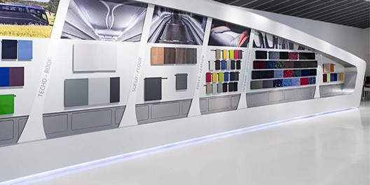 From the reception desk and its back panelling, to all the lining of the premises, as well as the displays, furniture, columns, counters, and meeting rooms, all have been manufactured with DuPont™ Corian®. On the second floor, with 1,200 square meters, a contemporary and innovative space has been developed for coach definition, client’s reception and brand experience. The showroom includes all the upholstery and lining options of the Group, physically and virtually, to create bespoke designs of the coaches for their respective clients. For this reason and to cover the needs and functionalities of each area of the headquarters, Dab Leioa workshop has created a high number of different molds and about 120 sheets of approximately 6mm each made of Corian®. A much needed and complex technical development has been undertaken in order to cover the variety of different elements that encompass the totality of the space as a whole.