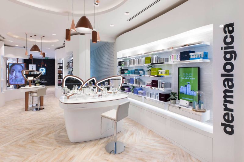 Corian® in Glacier White (beauty bar tops, display shelves) and new Grey Onyx (back walls to the shelving systems and treatment rooms) in the new Dermalogica store by Limeblue Ltd.