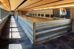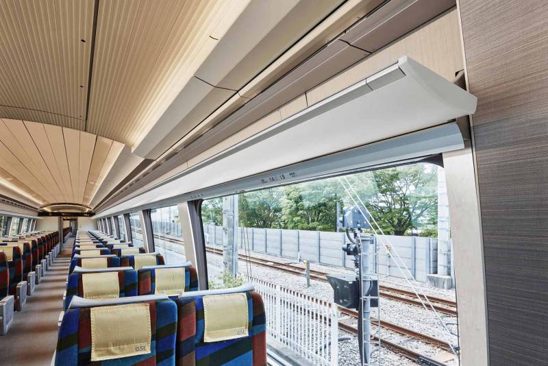 The first car that contains the scenic seats (which is said to symbolize the Romancecar) has a windshield made from large, curved glass and there are no luggage racks to ensure dynamic views. Curved glass, one meter high, is also used for the side windows so that people in the regular seats can also fully enjoy the scenery. We spoke with Mr. Noriaki Okabe, representative of the Noriaki Okabe Architecture Network, who designed the train cars. He said, “Regarding the essence of design, we prioritize how much space we can create in interiors. This is the biggest factor that provides good livability. When designing a train—which cannot be said to have a great deal of extra space—we had to minimize the impact of luggage racks and make the ceiling seem larger. To that end, we designed the luggage racks so they wouldn’t harm the sense of space, with a soft impression like a cloud floating in the sky.” Corian® Solid Surface was used as the material on the curved underside of the luggage racks and the covers between the windows. Mr. Okabe said, “In addition to fabrication qualities, this material also helped create the visual texture and spatial qualities we wanted. Our general design philosophy is to incorporate the warmth of a wood to a moderate degree, but for the GSE we wanted to further highlight a brighter, more modern look. I think Corian® Solid Surface has a texture with a gentle impression like wood or stone—one that anyone can sense—as well as a modern expressiveness.”