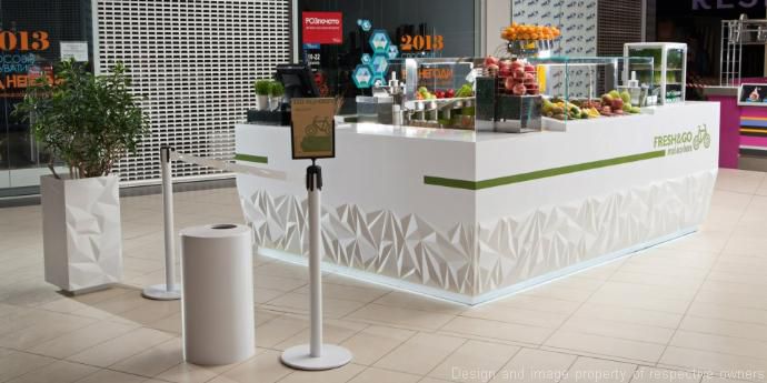 The ergonomic counter of the eco bar is made of Corian®, (in the Designer White color), which is notable for its perfect modern aesthetics and high hygiene properties. Owing to the high indices of durability and ease of forming of Corian®, the designer fashioned the counter base with a texture that evokes associations with cracked ice and Japanese art of origami. The technology of seamless junction by Corian® makes the surface look ideal in comparison with the natural stone, as all the places which are typically getting dirty – usually they are seams, joints or natural pores of the material – are absent here (which also distinguishes it among similar materials). The interesting mix of properties of Corian® – hardness, resistance, durability and repairability –enables it to maintain its initial state for a long time, which is quite important for a place with high passability.