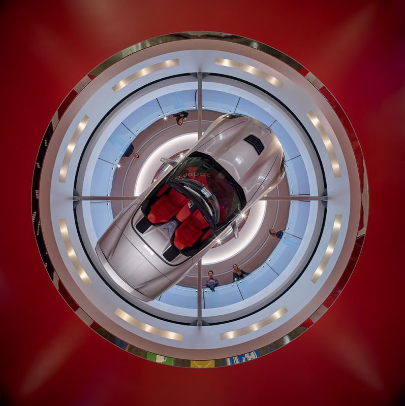 At the entrance, visitors see a sleek 2016 Corvette automobile suspended upside down over a mirror-polished stainless steel reception. Set into the desk’s oval countertop is a Corian® surface in Designer White tone with an elegant stripe in the Royal Red and Silverite shades that recalls those seen on racing cars – the same three Corian® colors are used elsewhere in the office.