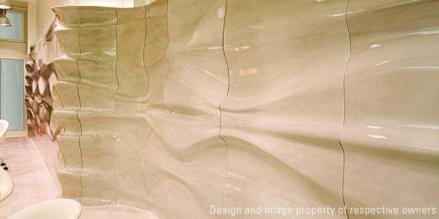 Reception, consultation and make-up areas: flowing wall panels made with Corian® solid surface.