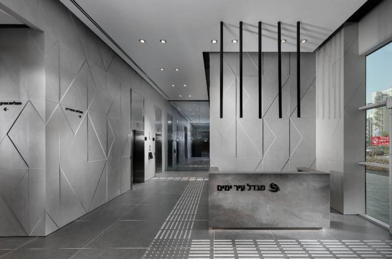 Ir Yamim high-rise office tower in Netanya, Israel: the lobby features a reception area with wall cladding made with 3D geometric panels of Corian® Solid Surface in the recently introduced Neutral Concrete colour; project by MYS Architects; photo by Elad Gonen, all rights reserved.