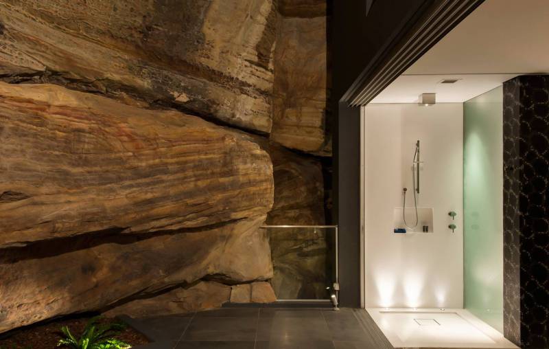 As if it is a part of the building’s structure, the rock face offers an organic and rich aesthetic. “Bifold doors were designed to fold away so that during the warmer months, these doors could be open to create amazing cross-ventilation but to also connect with nature taking a cleansing shower (Corian® Shower walls and floor) — one’s own private wellness retreat,” says Darren.