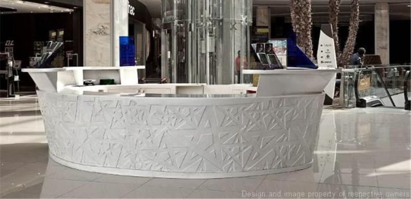 The shopping center could be considered the ultimate guide on the use of Corian® and its limitless applications. The techno-surface has been thermoformed, glued, carved, molded and inlayed. It has been used to create monolithic and seamless furniture. In fact, not only the IMAX® walls and counters but also many interior furnishings inside Morocco Mall public spaces and luxurious stores are in Corian®, among which: the entrance white reception desk decorated with a five-pointed Moroccan star pattern; all the black and white signaling totems, the TV panels that provide tactile information; the advertising screens, the “static directory” board located at every floor and bathroom design in the VIP area. Furthermore, countertops on the second floor restaurants are in Corian® which has been chosen for this application both because it is easy to clean and for its hygienic properties and durability.
