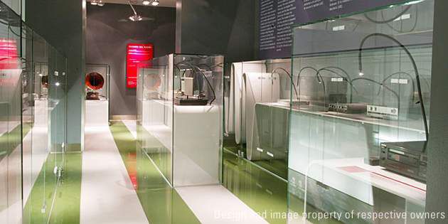 Adjacent to the Leonardo Gallery is the Time Measurement section and Workshop of the stringed- instrument maker. The new Sound Section makes the most of the limited space available (62.5 m²) thanks to the use of Corian® solid surface in Pearl Grey ribbons “unfurling” parallel to the longer walls (6.4 m) and other ingenious interior design architectural solutions. These include, for example, a back-lit opaline glass wall, which seems to broaden the room, and a number of ultra-clear glass cabinets that house the objects on display without obstructing the view.