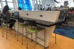 The Loft by Brussels Airlines at Brussels airport (Belgium); Corian® Solid Surface in the Glacier White color has been used for office desks and coffee tables integrating wireless charging solutions; photo courtesy of Brussels Airlines, all rights reserved.