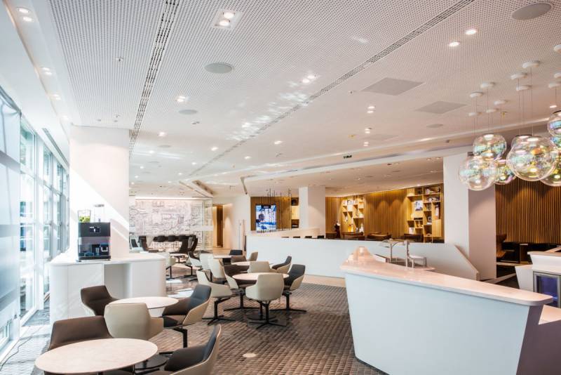 The Loft by Brussels Airlines at Brussels airport (Belgium); Corian® Solid Surface in the Glacier White color has been used for the pillar cladding; photo courtesy of Brussels Airlines, all rights reserved.