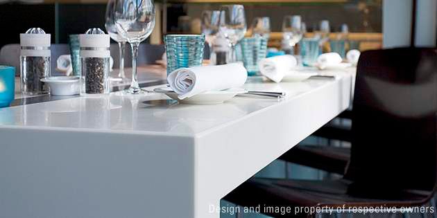 Combining superior functional and aesthetic qualities, Corian® solid surfaces are well suited for commercial applications. Impressive oversized tables and counters in the brasserie and restaurant feature smooth surfaces, thanks to the material’s inconspicuous seams. Corian® is also easily combined with other materials. Vanilla-coloured table tops made of Corian® contrast beautifully with the nearly black look of Macassar Ebony wood. In the main restaurant, the stainless steel stand of an 8 metre Corian® solid surface table top reflects the cool metallic look of the walls.