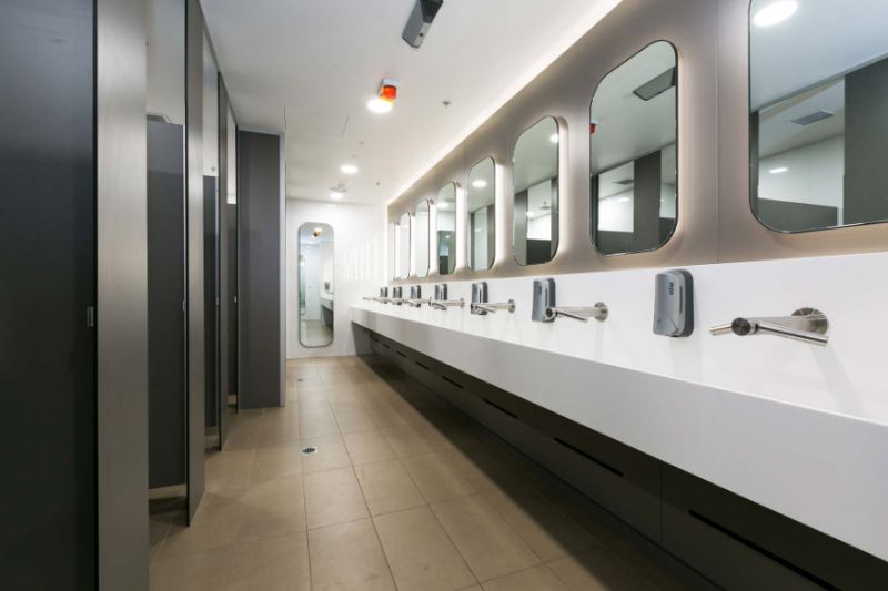 Stunning Corian® Solid Surface Glacier White was used for all of the terminal’s bathrooms. Well-suited to the demands of the high traffic environment, Corian® Solid Surface provides a striking, seamless sink and hand washing experience. Fully integrated Dyson Airblade™ taps allow travellers to wash and dry their hands at the same location, significantly reducing overall time spent in the bathroom and reducing cross-over traffic between sinks and hand dryers.
