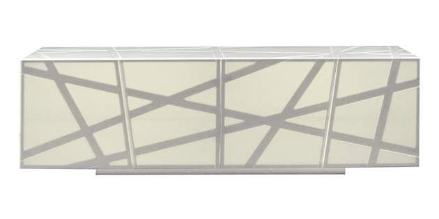 The tables and their structures, made with Corian®, contain no screws or metallic parts of any kind are apparently seamless in nature. The outside of the cupboard doors have been engraved with the same banded pattern, while the interior surface has been “hollowed out” to allow the soft illumination to filter through.