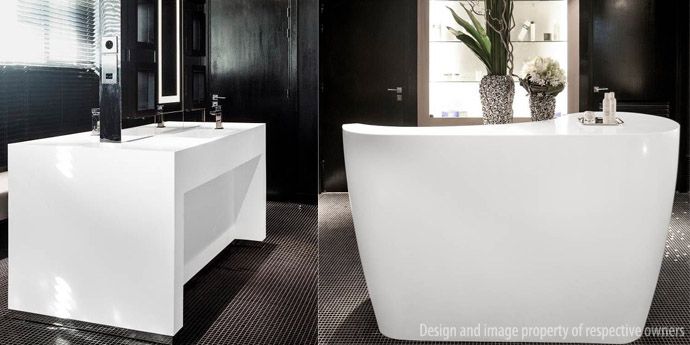 The dualism between Moroccan tradition and chic modernism can also be appreciated in every room, in which the white bathroom furniture made with Corian® match with black sumptuous mosaic floors.
