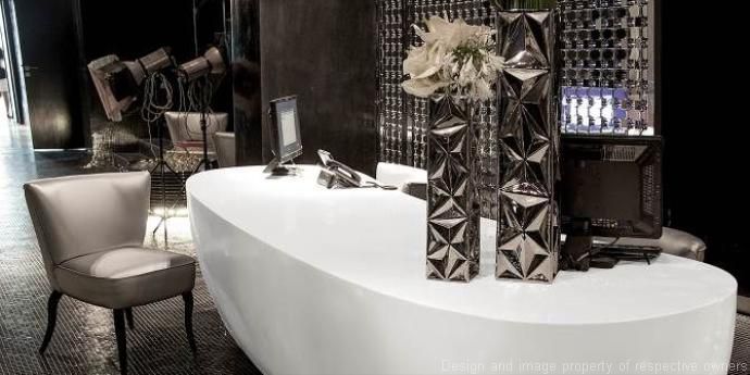 Behind the monumental exterior of the hotel, interiors present an ambiance that brings to mind exotic and warm reminiscences, mixed with impressive lighting and ultra-modern touches. To welcome the lucky guests of the luxury hotel, there is a reception desk realized with thermoformed Corian®.