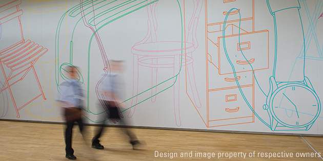 “Parade” - “Parade” is an 88m-long by 4m-high installation that covers the wall joining the bank’s older west building (designed by Sir Denys Lasdun in 1980) to the new East building (designed by Ingenhoven Architekten), forming one side of the cafeteria space. The largest work ever produced by Craig-Martin, “Parade” is a compendium of more than 60 different images of everyday objects – from a shoe to a piano, a football to a fire extinguisher. These overlapping images are “drawn” in 20 different bright colours of Corian® against a background of Corian® solid surface in Cameo White. Far more than mere decoration, the designs are intended to be part of the fabric of the building, both transforming and becoming an integral part of the spaces they occupy.